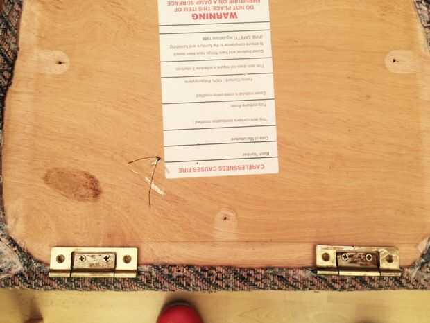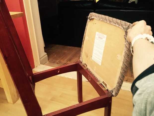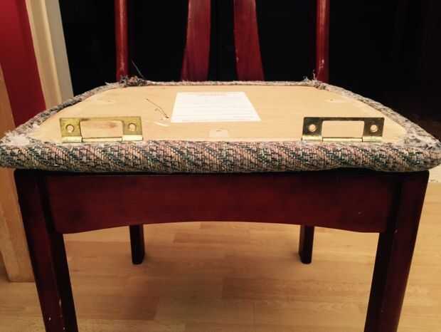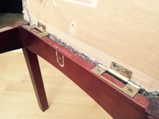 Nota: Las bisagras para el cojín del asiento se colocan en la parte delantera de la silla, para evitar cualquier descubrimiento accidental del compartimiento si alguien fuera a recoger el asiento del frente.