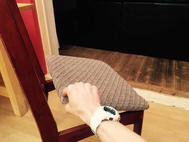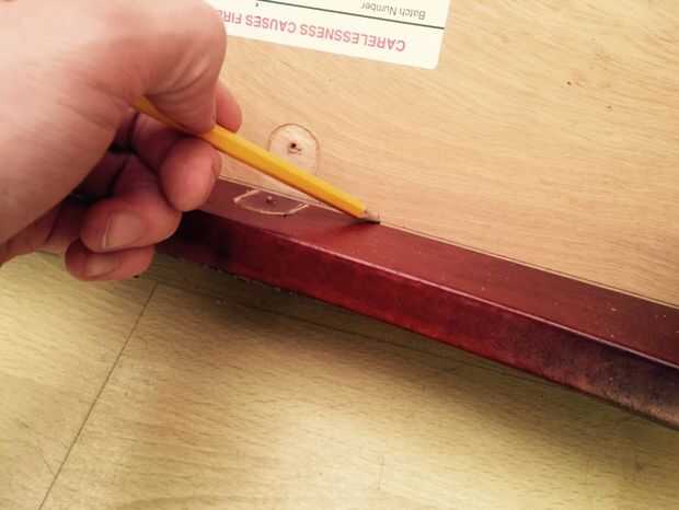 Comencé reemplazando el cojín del asiento y de trazado sobre la base de donde era la viga de apoyo que iba a adjuntar mi bisagras. Yo debo ha hecho esto antes de desmontar el amortiguador, pero eso fue simplemente mala planificación. Después de eso, había alineada con las bisagras igual distancia de cada borde, asegurando que tenía suficiente espacio entre sus bordes y las patas de la silla y había atornillada en su lugar.