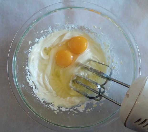 Agregar esencia de vainilla, 2 huevos a la vez y batir otra vez. Raspe los lados del tazón de fuente y agregar 2 huevos y batir otra vez.