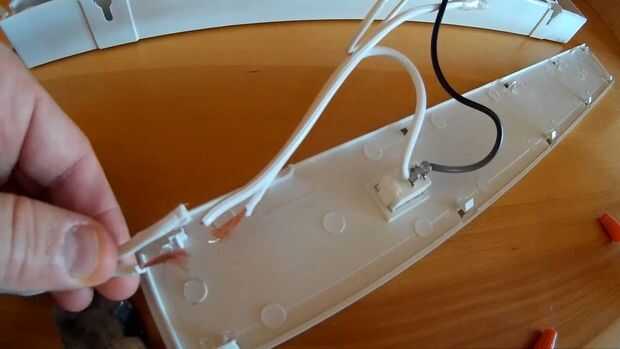 La lámpara que compré tenía un cable en ella con una tapa grande. También iba a venir por el lado de la lámpara (que sería visible). Quería salir de la parte trasera por lo que se oculta. Así que lo primero que tenía que hacer era cortar el cordón cuando entró la luz. Esto le permitirá enhebrar el extremo del cable a través de agujeros más pequeños ya que de lo contrario usted tendría que hacer un enorme agujero para encajar el enchufe a través. Usted podría también-de la soldadura el cable o su lámpara puede tenerlo conectado en un punto de unión con algunos tornillos o clips.