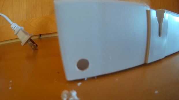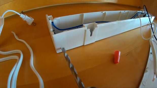 Tuve que taladrar un pequeño orificio en la parte posterior de la carcasa de la luminaria de lámpara (que es plástico) para permitir que el cable a través de la parte posterior de la mesa y en la lámpara. Si hay un agujero ya, tal vez puede utilizar eso. Tenía un agujero en la parte posterior de la caja ya hecha para los tornillos que sujetan la lámpara, pero preferí hacer mi propia la ubicación es mejor. Así que usando una broca de taladro, haga un orificio que es ligeramente más grande que el cable por lo que puede pasar a través de fácilmente pero ajustados.