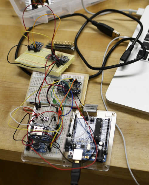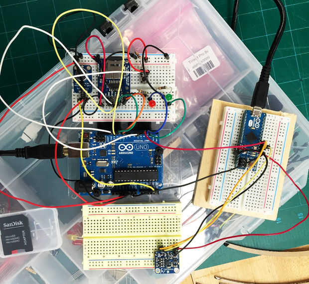 Debido a la complejidad de este circuito, es una muy buena idea al prototipo del circuito en un protoboard sin soldadura antes de soldar nada. El acelerómetro, cuando se llevó a cabo en la posición de retratos e inclinada hacia atrás, debe activar el LED verde a la luz y empezar a grabar [un dim LED roja parpadeará en la pantalla de tarjeta SD durante la grabación]. Si no hay tarjeta SD se inserta en el escudo, el LED verde debe parpadear. Una grabación de prueba y comprobar la calidad. Puede ajustar la ganancia en el MAX4466 girando un tornillo en la parte posterior del amplificador.