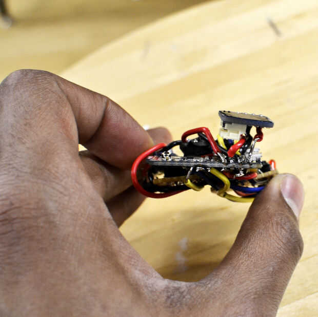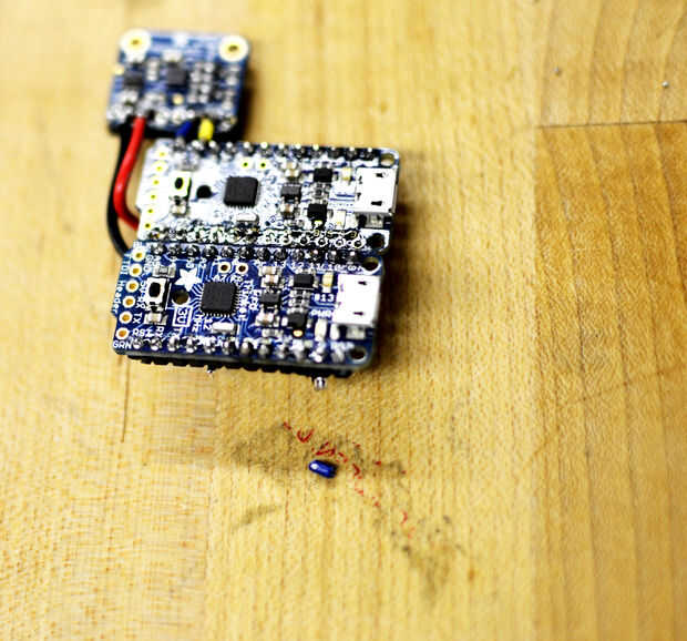 El pin de salida de la soldadura en el MAX4466 a A5 en 5V Pro, teniendo cuidado de colocar el MAX4466 en la parte superior izquierda de 5V Pro sobre el acelerómetro. Suelde el cable con el conector de tierra, dejando el otro extremo del cable unsoldered por ahora. VCC de la soldadura al pin 3V en la 3V Pro. Yo serpenteaba este cable por debajo de la Junta.