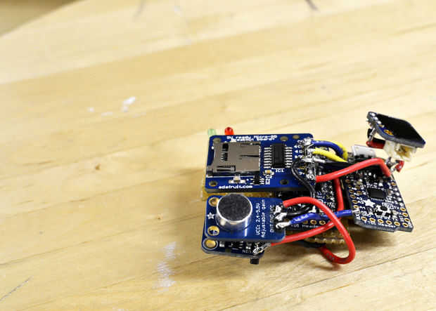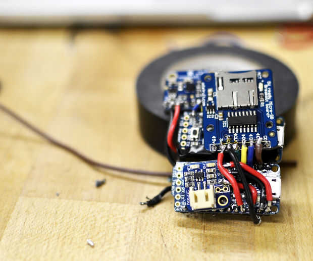 Coloque el protector de tarjeta SD en la parte superior el 3V Pro. El CLK de la soldadura de perno al pin 13 de 5V Pro, la DO pin a pin 12, el DI 11 pin a pin y CS 10 pin a pin por lo que la natural rigidez de los cables tiene la pantalla ligeramente elevado por encima de los 3V Pro [para evitar cortos]. Soldar el pin GND de MAX4466 para el pin GND en el escudo de tarjetas SD. Lata y equipamiento otro cable y soldadura para conectar a GND en el escudo de tarjeta SD y G en 5v Pro. Soldar el pin de 5V en el escudo al pin de 5V a 5V Pro. Suelde el cable de la BAT + en la 3V Pro al pin de 5V a 5V Pro, después de correr por debajo de los 5V Pro. Suelde el cable de G en la 3V Pro al pin de 5V G Pro.