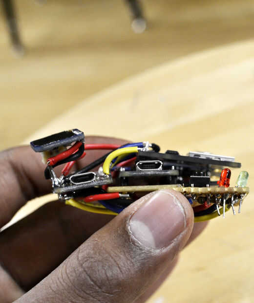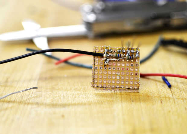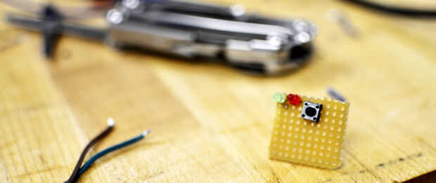 Soldar los LEDS y el pulsador en un pequeño rectángulo de una Junta de soldadura. Después de hacerlo, había soldado las resistencias de 560 Ohm a las patas negativas de los leds y la resistencia de ohmios k 10 a una pata del pulsador. Soldar las resistencias juntos, soldada a un alambre que corrí a G en 5V Pro. La pata positiva del LED verde se enciende al pin 6 5V; la pata positiva del LED va al pin 3. Un alambre entre la misma pierna de la tecla que tiene soldada a la resistencia de la soldadura y la clavija 5 5V Pro. La otra pata del pulsador [sé pulsadores tienen cuatro patas; Me refiero a la otra pata del mismo lado de la tecla] se conecta a 3V en el 3V Pro.