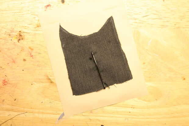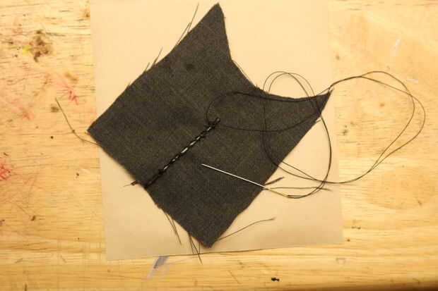 A continuación, deslice a la tela cortada en la horquilla. Mantener la horquilla en el centro de la tela y coser en el lado desigual de la horquilla. Asegúrese de no dejar al otro lado de la horquilla independiente.
