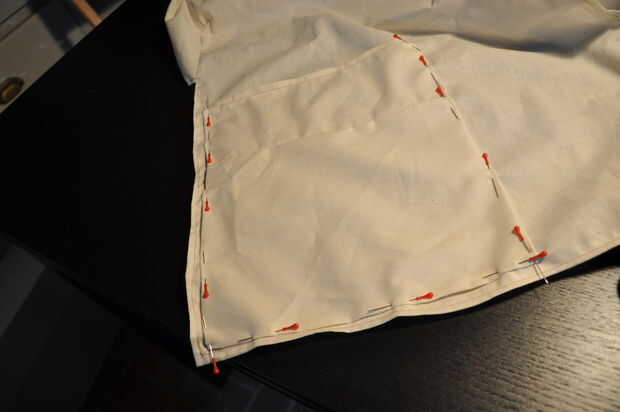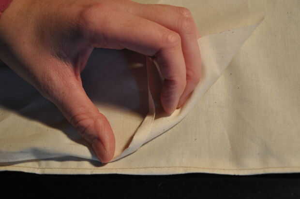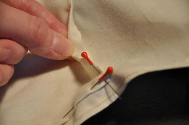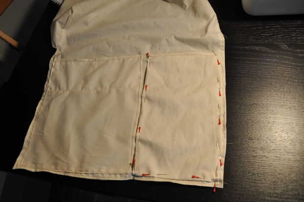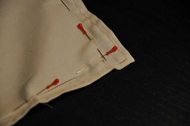 Perno en su lugar. Puede doblar todos los lados, como la alta costura y coser todo el camino alrededor y luego coser a la base de soporte, o se puede doblar sobre los lados, como muestro en la foto tres y coser las costuras y coser a la base de soporte de una sola vez.