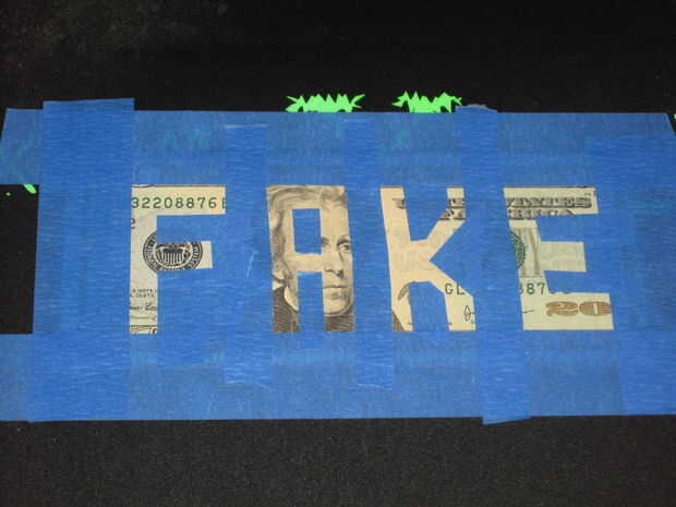 La segunda cuenta, escribí 'Falsos' en la parte frontal de la factura. Lo hice aplicando sólo la cinta de pintor azul a la cuenta directamente, dejando un vacío donde estarán las letras.