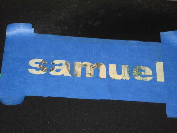 La primera cuenta que hice, escribí mi nombre 'samuel' imprimiendo el nombre en un pedazo de papel, aplicar la cinta de pintores azul alrededor de las letras impresas y transfieren la plantilla trazada para el proyecto de ley.
