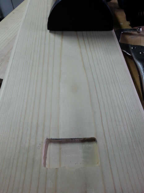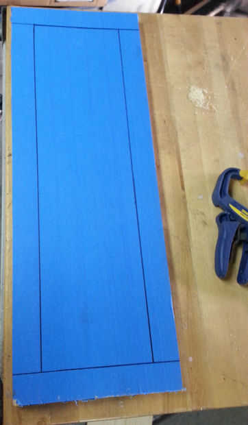 Utiliza un trozo de pino y había cubierto con cinta de enmascarar, había marcado hacia fuera las dimensiones de la muestra había centrada en la madera y cortar hasta el tamaño que necesitaba, enruta los bordes lisos y empotrar el área de la bisagra.