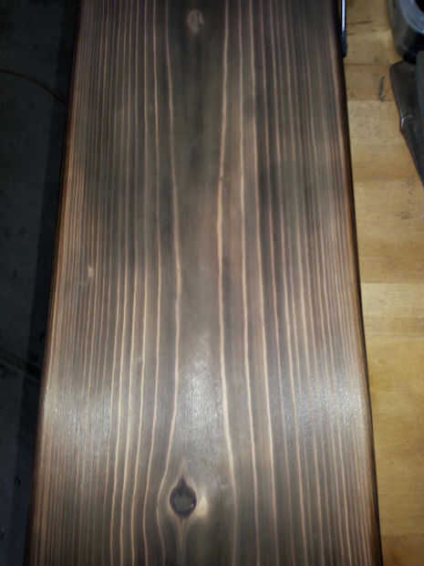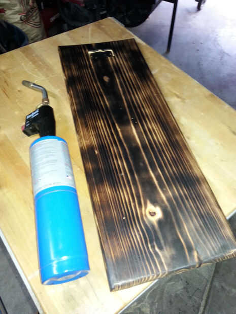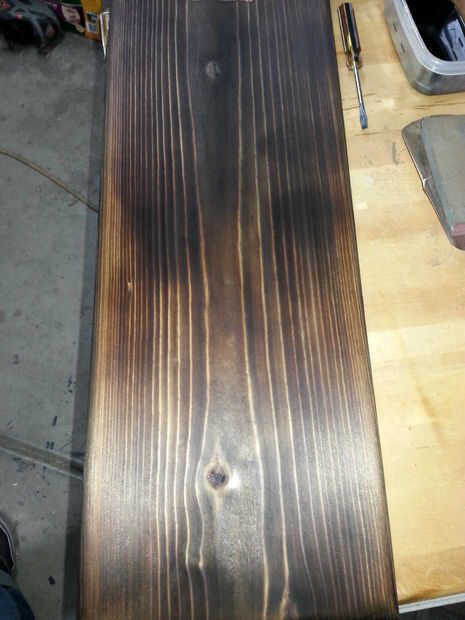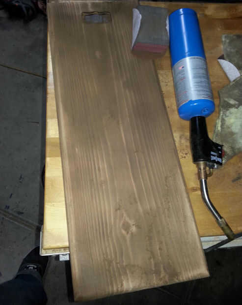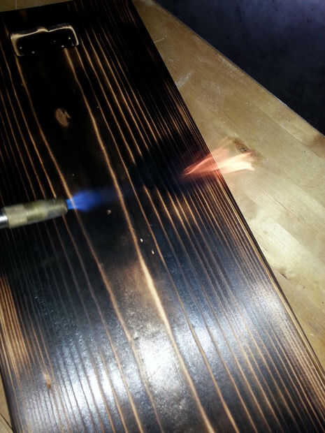 Quería un look rústico, por lo que cierta área de la antorcha un poco más pesado que otros, después carbonizado todo el tablero lijado con una lija de 250 y le dio una segunda quemadura (lijarlo muy pesado en alguna zona) después de la segunda con la antorcha utilicé papel de grano arena 2000 para sacar el brillo , finalmente limpiar con aceite de tung y deje que se seque.