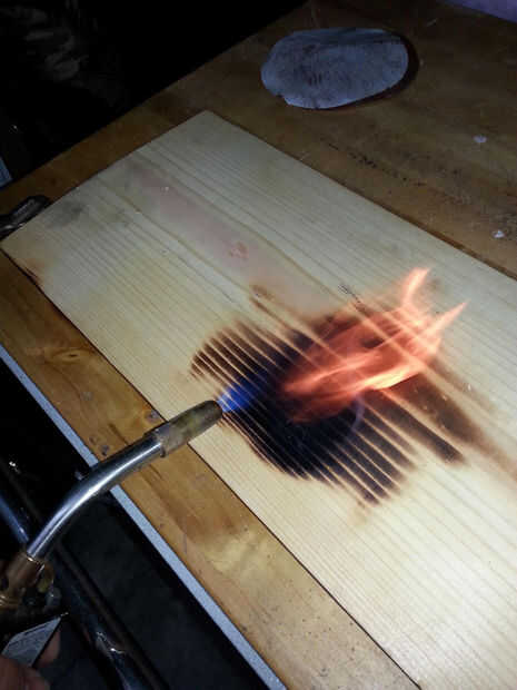Después simulado hasta que era hora de poner color a la misma, quería probar una técnica japonesa de la preservación de madera llamado Shou-sugi-ban, así salió el soplete. El olor a quemado era muy terroso y cálido.