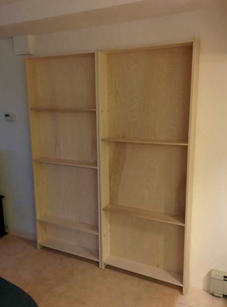 La 2ª puerta fue unida a sus diapositivas. Se agregaron algunos estantes. Se me permite acerca de 1/4 de espacio libre entre la parte posterior del libro de caja y la pared en la parte superior e inferior. Esto ayuda a reducir la cantidad de luz que se escapa hacia fuera y arruinar la ilusión. Yo puedo grapa en fieltro negro para aislarlos aún más.