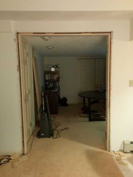 Cuando tira de la moldura existente, hubo cuñas débiles sosteniendo el marco. Tuve que retirarlos y rellenar con madera sólida en la parte superior y los lados puesto que soportan mucho peso.