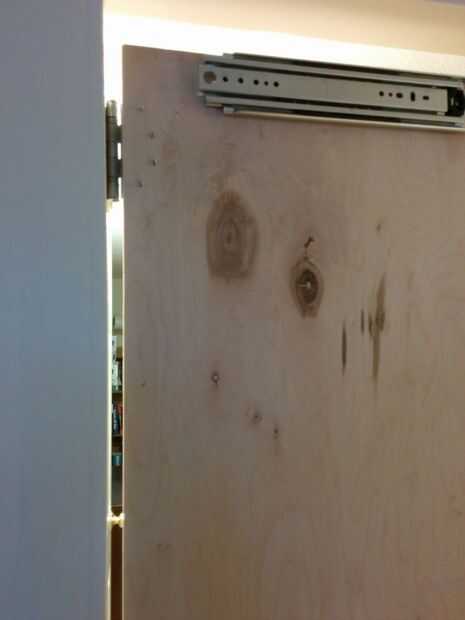 Las 500 libras completo diapositivas del rodamiento de extensión fueron atados a la parte superior e inferior de la puerta con bisagras. Determiné que 14" movimiento diapositiva era óptimo.