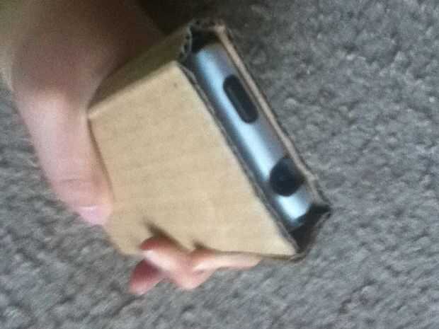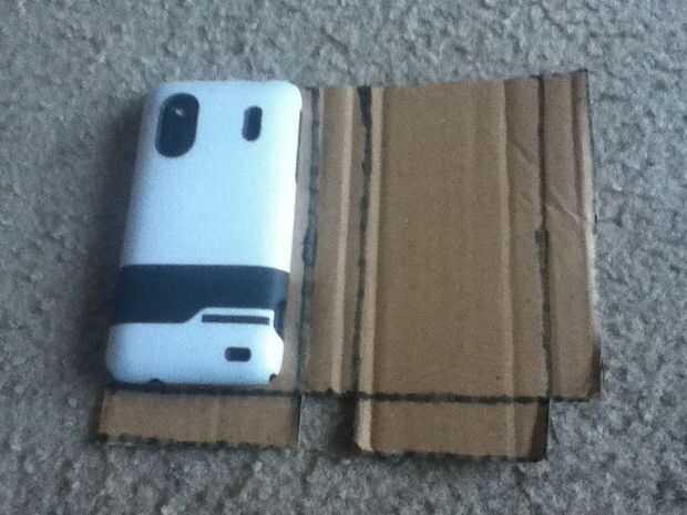 Asegúrese de que el teléfono quede, luego recórtalo. En la cara que se utiliza para la pantalla, dejar un poco de cartón sin cortar para que el teléfono no caerá fuera de la caja. No necesita ningún cartón en la parte superior del teléfono, porque se trata de cómo se coloca el teléfono en el caso.