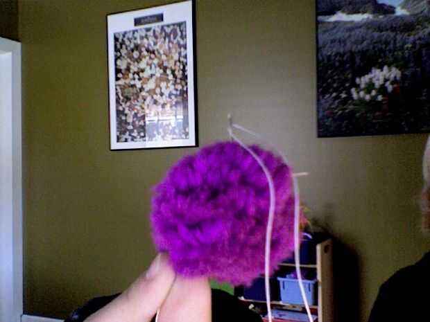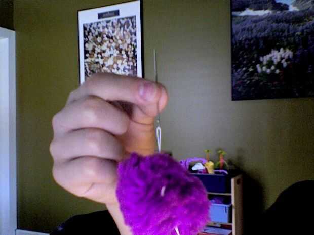 Ya que este es un sencillo proyecto, realmente sólo necesita un paso para construir el juguete.  Inserte la aguja (con hilo en él, por supuesto) como cerca de la mitad de la bola de hojaldre como sea posible. Páselo a través del otro lado a la longitud deseada. Tiró a unos 2 o 3 pies. No tire de él a través; dejo algunas en el extremo opuesto a un nudo (tal vez 3 veces) para que no deslice hacia fuera.