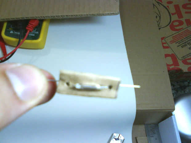 El interruptor de láminas se pegan en un pequeño trozo de cartón, los bordes con pegamento caliente a manejar porque es muy frágil.