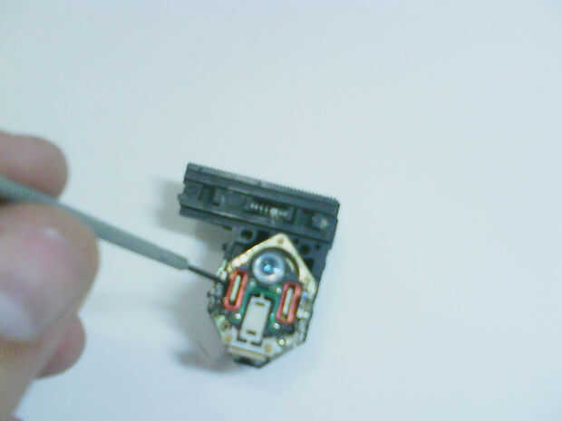 Abrir el lector, resaltando la óptica, el motor que ejecuta el cd y la cantidad de metal está en sobre el motor, ajuste el álbum a él. En la óptica, retire los dos imanes. Ten cuidado porque estos imanes son muy fuertes y pueden unirse, hiriendo a los dedos o la mano.