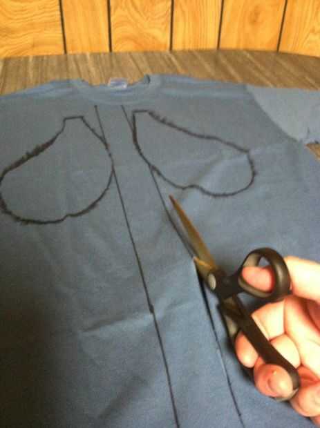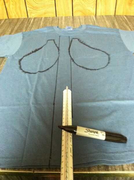 Usando el rotulador, dibuja dos líneas verticales desde la parte superior a la parte inferior de la camisa (funcionará cualquier borde recto, no necesitará usar una regla), intersección de los contornos de la plantilla de unos 3 a 4 pulgadas (o aproximadamente 3 dedos-valor de longitud). La razón por la que se entrecruzan la plantilla es porque queremos este esquema como una caja de revelado, y a coser todo junto en los pasos siguientes, lo que es lo suficientemente fuerte como para llevar el agua.