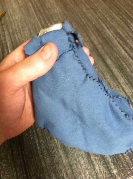 Una vez adentro, coser el último lado corto con la misma técnica que utilizamos en el paso anterior. Debe tener algo exceso de tela en la parte superior el odre de agua que no fue cosida. Cortar todo a la misma longitud (uno es generalmente más largo que los otros) y doblar sobre el odre de agua (ver imagen). Esto creará un borde mucho más limpio a la tela.