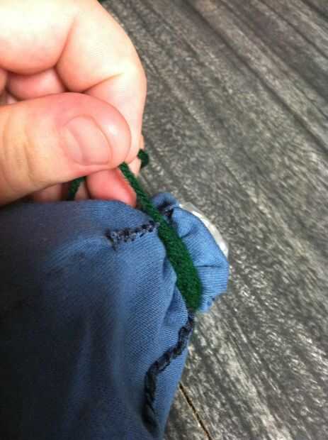 Tomar el hilo (o cualquier cadena que tenga - lo que parece funciona mejor) y comienza a enroscarlo alrededor de la parte superior del odre de agua, pasar la tela doblada sólo corte. Enrolla el hilo en cualquier lugar de 10 a 25 veces en la parte superior de la botella. Esto va a proteger a la botella y la bolsa dentro del odre de agua y añade un bonito detalle para nuestro proyecto. Nuevo, color es su opción - azul y verde solo hay que ver increíbles juntos.