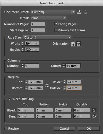 He creado este menú en una extensión de tamaño A2, debido a su tamaño y forma, A2 es el más pequeño papel estándar podía imprimir en. Creando de esta manera en lugar de introducir las dimensiones exactas del menú le permite obtener una visión completa y añadir información en las fronteras (se corta) de Indesign, añadir líneas de doblez adicional, guías etc. de corrimiento.