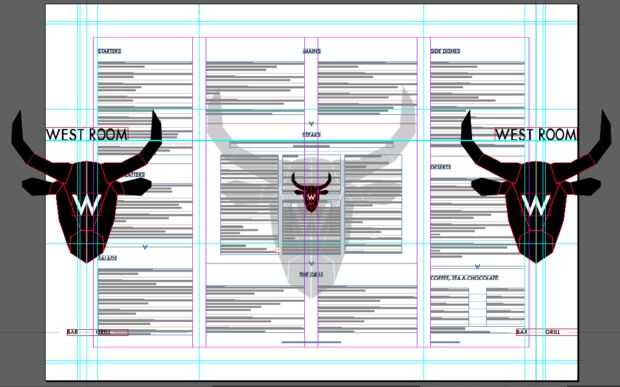 Finalmente 'Bar' y 'La parrilla' fueron agregada al frente con un 0.5pt línea de a través de la página. Esto mantiene simplista y en línea con el estilo de todo el menú.
