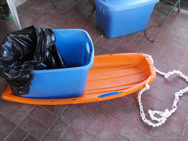 Necesitaba alguna forma de salir basura unbaggable profundas inaccesible a la cabeza de sendero sin romper mi espalda. Este trineo debe deslizarse sobre los lazos de carretera ásperos superficie, grava y ferrocarril. Porque está hecha de materiales reciclados bajo grado espero que sólo duran un par de años pero cuando va a la papelera de reciclaje grande en el cielo, otro se puede hacer en un apuro.