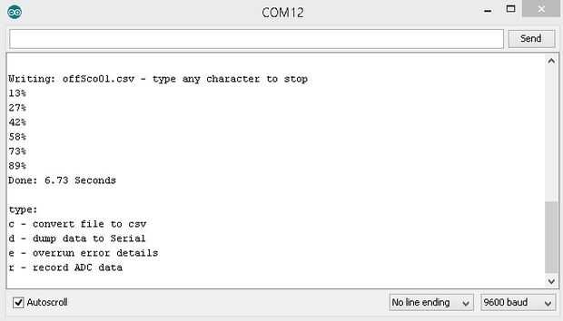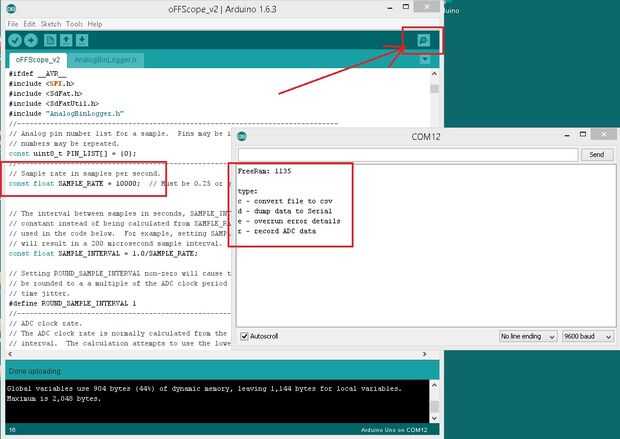 Sube tu programa de oFFscope modificado a tu arduino y abrir a monitor serial