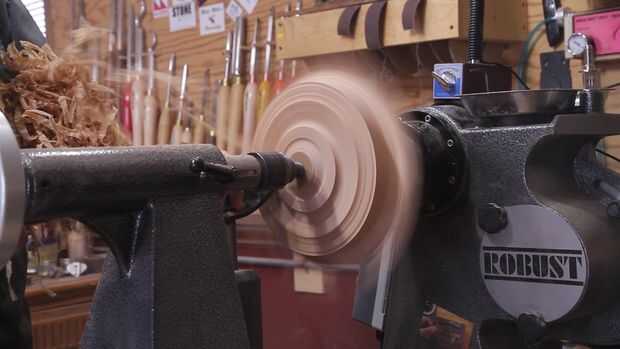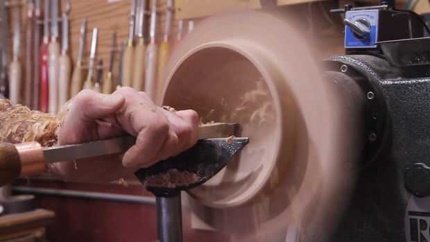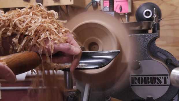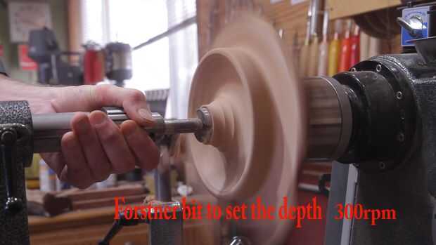 Montar el recipiente en el mandril con la espiga que hice en la parte inferior. Otra vez estoy usando una gubia de tazón de 5/8" para cortar la parte superior de las alas superiores. Prueba y que sean del mismo grosor que las alas inferiores. Usé un forstner para fijar la profundidad del tazón de fuente. Esto hace más fácil de limpiar y le permite saber lo cerca que está recibiendo en la parte inferior. Utilicé una herramienta para limpiar el material en el interior de la taza de acabado de carburo.