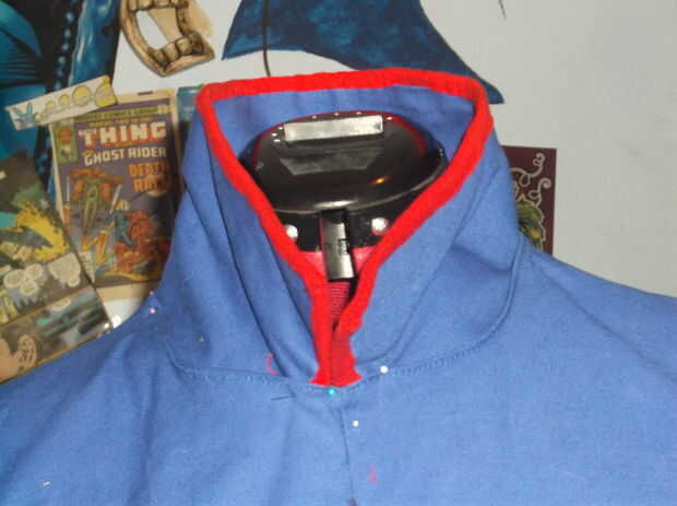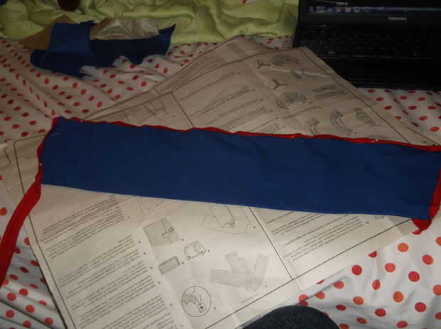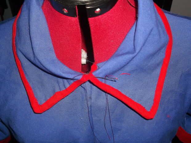 debe terminar con una forma trapezoidal), cortar dos piezas de la forma que a hecho y los lados juntos dejando una abertura antes de girar el collar que acaba adentro cose y cose la abertura cerrada. Después de crear el collar es necesario crear el rojo borde que recubre el exterior del collar; Así que empieza, cortando una tira muy larga de la tela y doblar los bordes crudos en hacia el centro (
