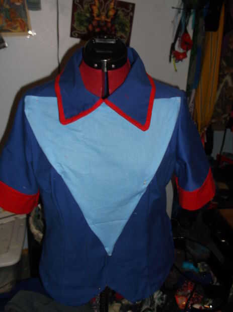 En primer lugar, cortar dos triángulos grandes de la tela azul brillante (hacer los triángulos un poco más grandes y necesario para que sean fáciles de ajustar). A continuación, apliques o doblar bordes bajo y perno de la triángulo a la mitad de la parte delantera de la camisa y uno en medio de la parte posterior de la parte de la camisa. Finalmente, ajuste el tamaño y la forma de triángulo como sea necesario y mano coser alrededor de los triángulos a cada lado de la camisa cuando usted las consigue ajustar a tu gusto.