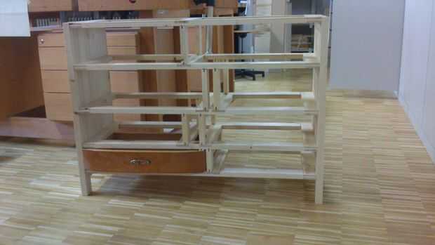 Después de organizar los diferentes cajones y hacer un plan, empecé a construir una estructura de listones de pino. Como que no llega a pesado en total.