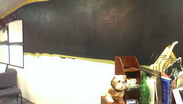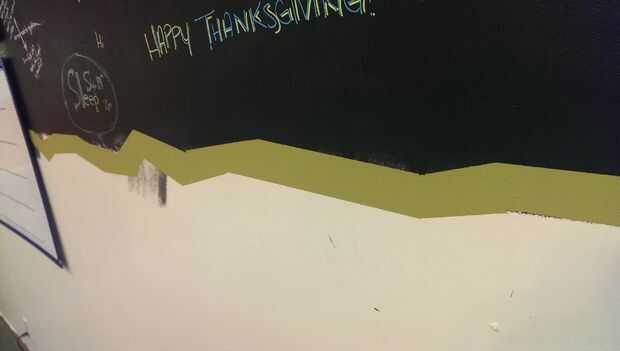 Así que utilicé la cinta de pintor para hacer líneas en zigzag que eran aproximadamente paralelas entre sí; una línea en la magia negra y la otra la pared crema. Luego usé la muestra de pintura de Orégano triturado $.50 como pensé que funcionaría bien para un huésped. Funcionaba bien y me no encantó mi ninguna tonteria frontera zig-zag a mi pizarra. Pero en retrospectiva Ojalá que había utilizado lo de Dalen olímpico Duckling! Es tan divertido tono de amarillo y hubiera dado loco buen contraste.