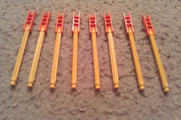 Tomar una barra amarilla y conéctelo a un conector naranja. Repita el procedimiento para obtener ocho piezas total. A continuación, coloque dos piezas en la barra amarilla en la obra que hiciste en el paso anterior. Repita para todas las cuatro piezas. A continuación, conecte las piezas de medidas 10-11 para la pieza principal de la base. Conecte las barras amarillas a los conectores gris central y los extremos a los conectores "Y" diagonal y los conectores de extremo gris.