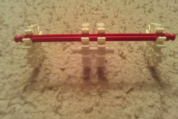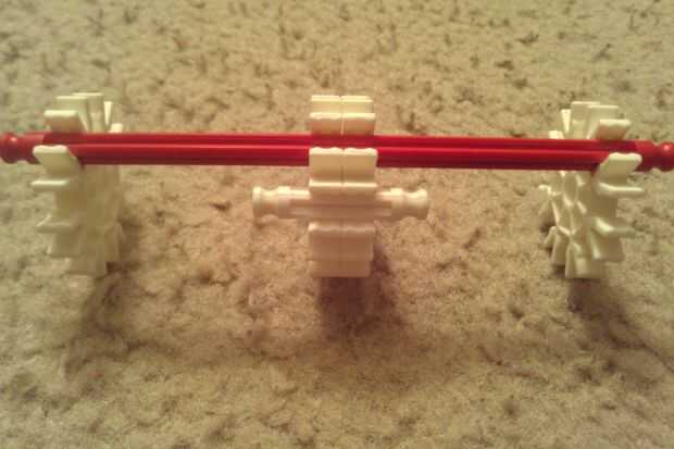 Tomar cuatro conectores blanco más y fijarlos en una barra roja. A continuación, les espacio como se muestra. Luego, añadir una barra blanca en el mediados dos conectores blancos y deslice los dos conectores a cada extremo de la varilla blanca. Finalmente, conecte este a pieza neckpiece principal como se muestra.
