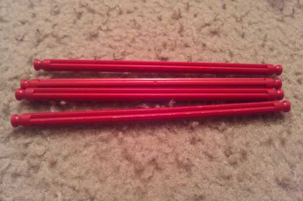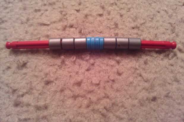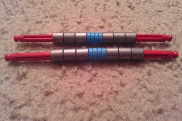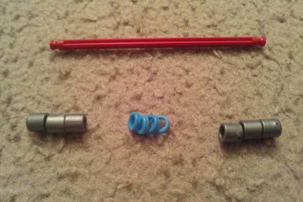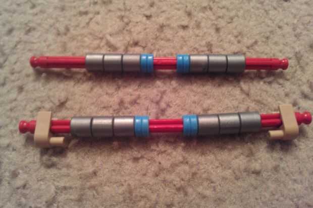 Una barra roja y añadir seis separadores gris y cuatro separadores azules como se muestra. Repita para una segunda varilla. Luego, añadir dos cerraduras de rotación tan a una de las barras. A continuación, separar los separadores de la varilla en dos mitades. Después de eso, agregue las barras para las piezas principales como se muestra. Luego, añada cuatro barras rojas sobre la pieza principal como se muestra.