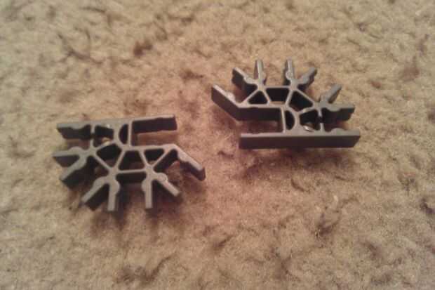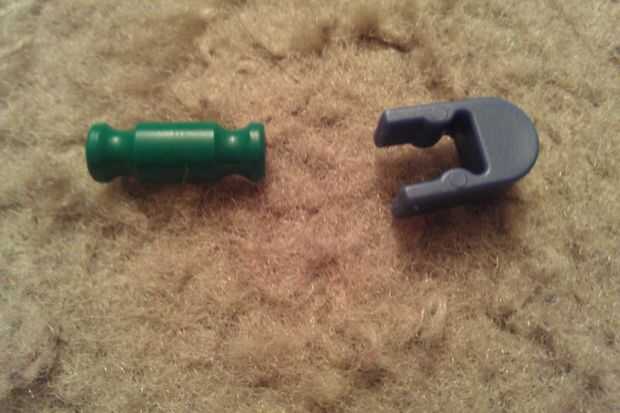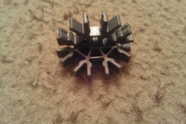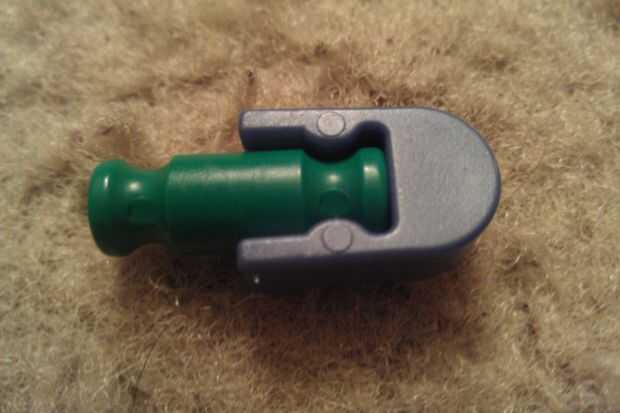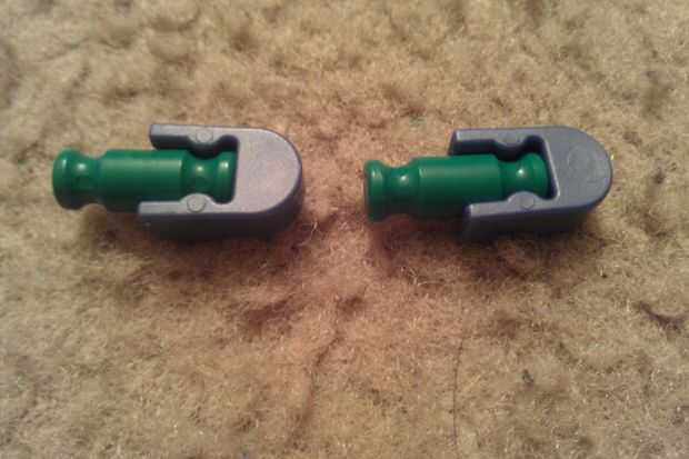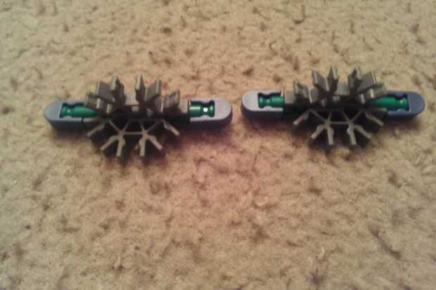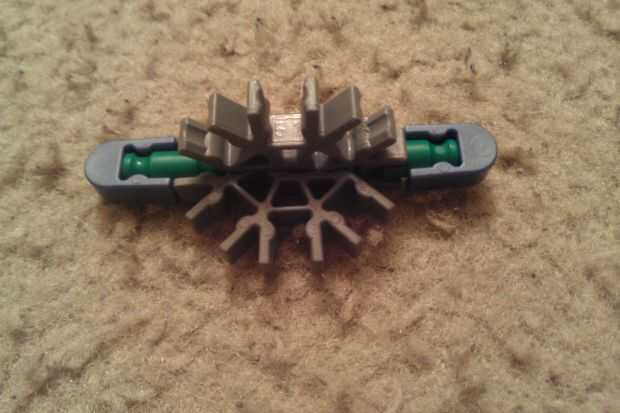 Tomar dos conectores gris y deslícelos juntos como se muestra. A continuación, conecte una barra verde para una gorra azul. Repetir dos veces, luego agregar a los conectores gris. Luego, repita el procedimiento para obtener dos piezas total. A continuación, añadir las piezas a la pieza principal como se muestra.