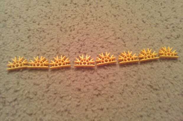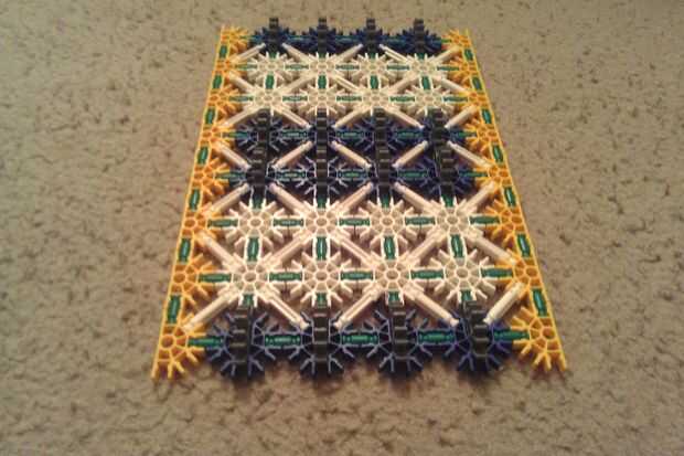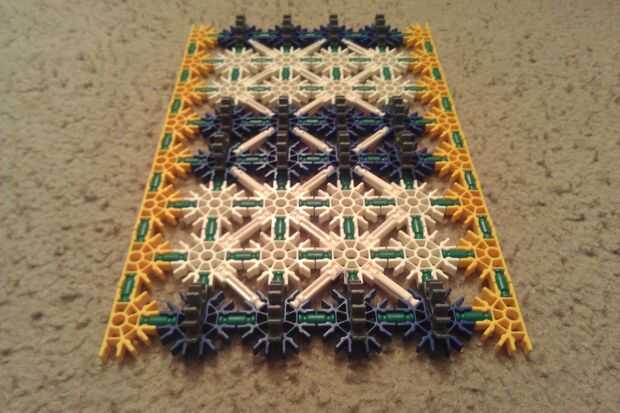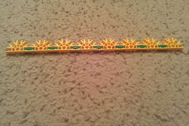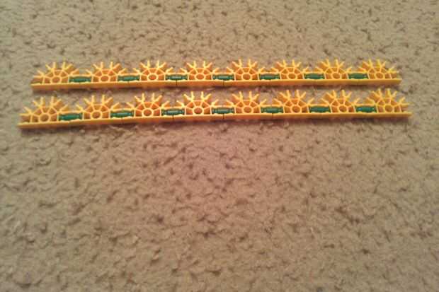 Tomar ocho conectores amarillos y conectarlos con barras verdes. Repita el procedimiento para obtener dos piezas. A continuación, conéctelos al resto de la base usando barras verdes. Finalmente, rellene todos los espacios con barras blancas.