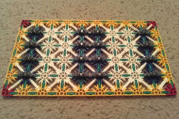 Añadir cuatro conectores rojo a las esquinas de la base usando barras verdes. A continuación, rellene todos los espacios con barras blancas.