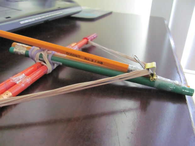 ¡ Hola! Este es mi 1 º instructableHoy voy a mostrarles como hacer una ballesta de lápiz.Aquí están los materiales:-4 lápices-1 pluma-8-10 mediana a grandes bandas de goma-medianas 1 broche aprietapapel1 envoltura de goma bandas alrededor de los 2 lá