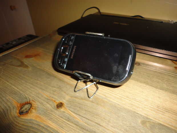 Mediante la adición de dos clips de papel regulares doblados como pequeños pies hace un soporte de escritorio decente así. Esto todavía funciona, pero he encontrado una mejor solución para convertirlo en un soporte de sobremesa agradable mediante el uso de un solo clip agregado... (ver fotos)