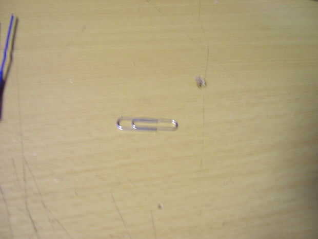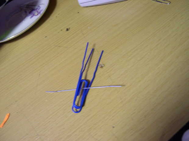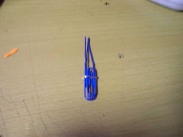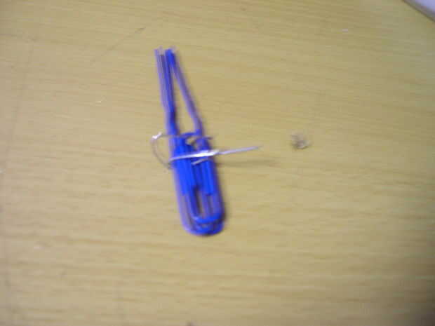 Straightenout el clip más pequeño en una línea. Pasar por el agujero de los tres clips de papel grandes y enrolle el cable alrededor.