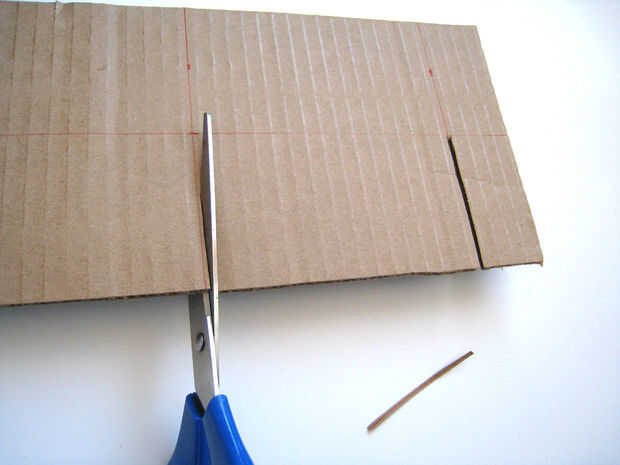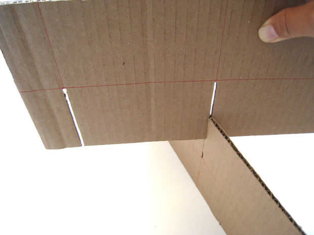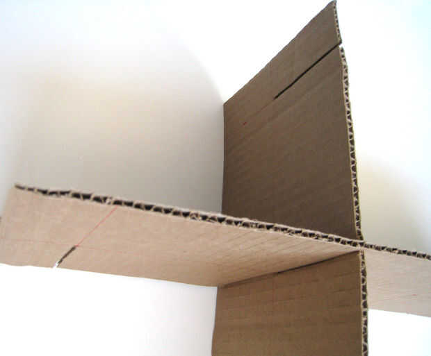 Para unir 2 piezas de cartón en una cuadrícula 3D (usada debajo de la silla), las muescas se utilizan aquí. Trazar líneas donde van las muescas en las 2 piezas, luego dibuje otra línea por el medio. Uso de tijeras para cortar una muesca de 1/8" a 1/4" de ancho centran en la línea. Esto permitirá que las 2 piezas que encajan perfectamente entre sí.