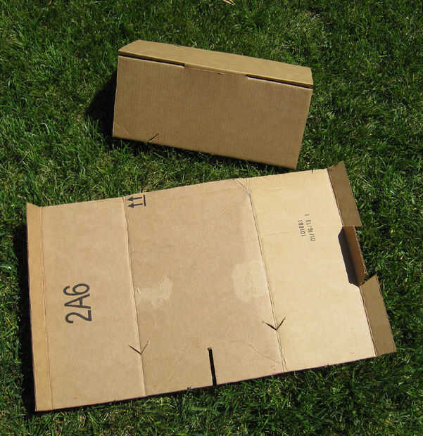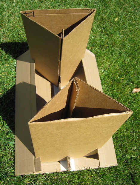Para hacer una de las patas, corte un pedazo de cartón 16 "x 27". Hacer 4 pliegues como se muestra, cortar 3 muescas y una lengüeta y ranura para traben la forma triangular. La lengüeta y la ranura pueden tener cualquier longitud entre 4" y 6" y centraron en la longitud vertical.
