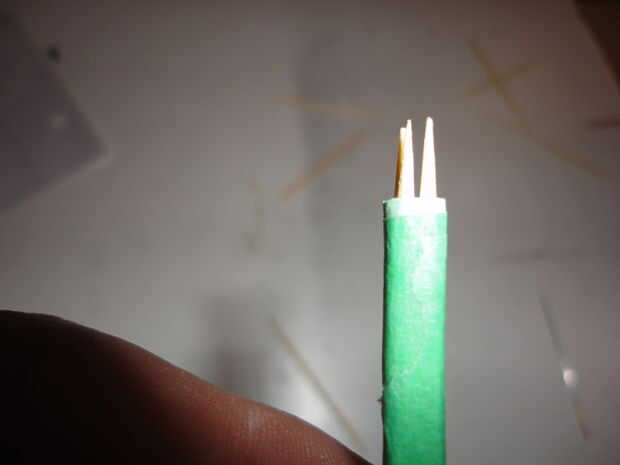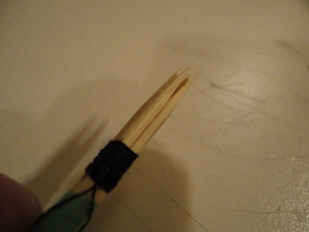 Comenzar por posicionamiento el palillos juntos y poner un trozo pequeño de cinta sólo para mantenerlos mientras que usted consigue el hilo iniciado.