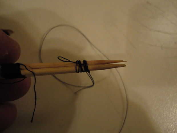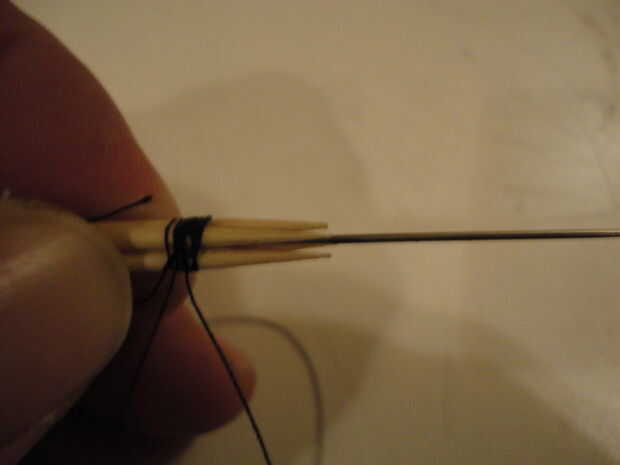 Dejando un poco suelto, detenga la bobina y coloque la aguja en posición. Que desea que se celebrará en el centro de los cuatro palillos de dientes. Deben ser introducido solamente un poco maneras, justo después de su liquidación inicial.