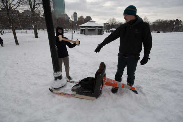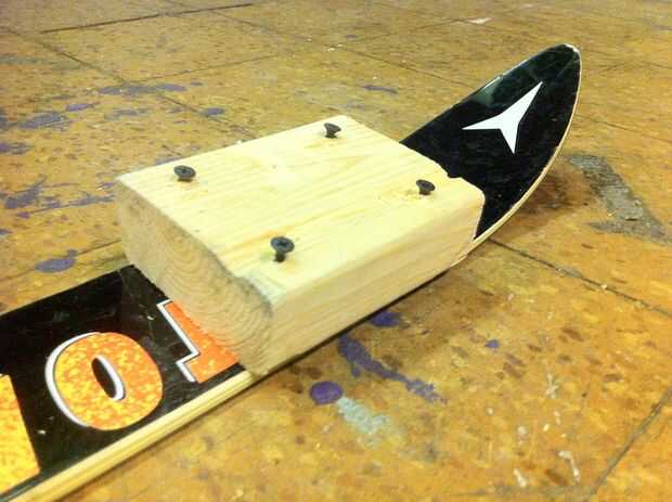 Comenzamos con una pieza que abarca el paseo de los esquís para descansar los pies, pero este rápidamente se rompió cuando el trineo se encontró misteriosamente atraído por este poste de luz en una fatídica (ver foto). Después de esto, uno de nuestros bloques de pie interrumpió totalmente. Si usted puede encontrar una mejor manera para fijar bloques de aquí se debe utilizar. Epoxy, caliente pegamento, atornillar por debajo...
