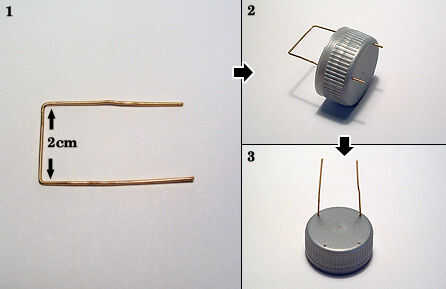 Ahora dobla uno de los Clips de papel utilizando las pinzas para que quede un espacio de 2cm en medio de los dos brazos. Esto va a ser empujado a través de los agujeros en la tapa de la botella que son 2cm de separación, para que los brazos señalan la parte superior.